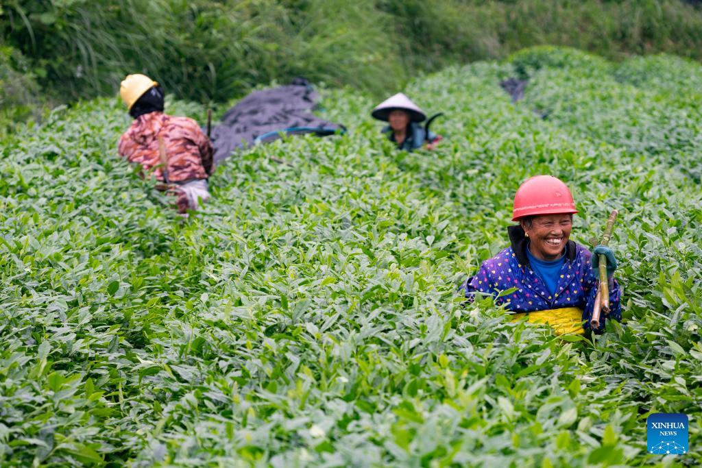 Tea farmers work at a tea garden in Jiangkou County, southwest China's Guizhou Province, May 15, 2025.