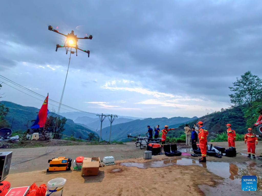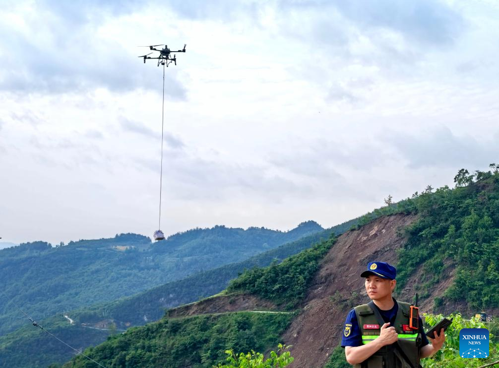 This photo taken by a cellphone shows rescuers operating a drone to transfer relief goods after the landslide in Qingyang Village of Guowa Township in Dafang County of Bijie City, southwest China's Guizhou Province, May 22, 2025. A landslide struck Guowa township in Dafang County under the city of Bijie on Thursday, trapping 19 persons.
