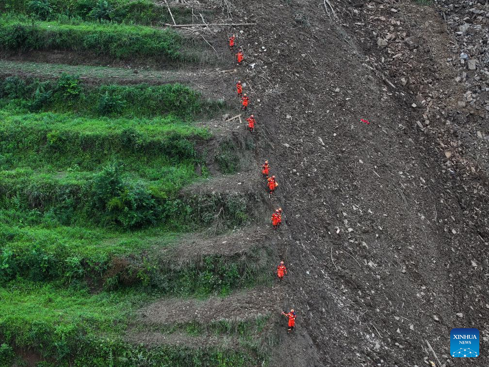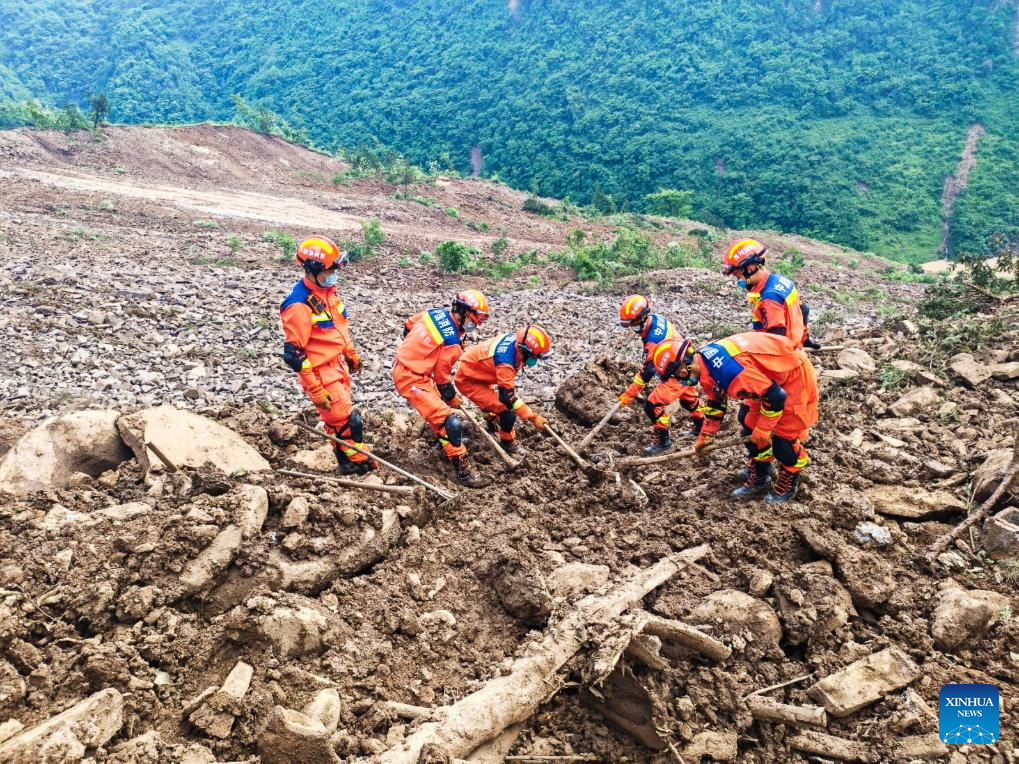 Rescuers conduct rescue work after the landslide in Qingyang Village of Guowa Township in Dafang County of Bijie City, southwest China's Guizhou Province, May 22, 2025. A landslide struck Guowa township in Dafang County under the city of Bijie on Thursday, trapping 19 persons.