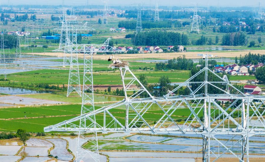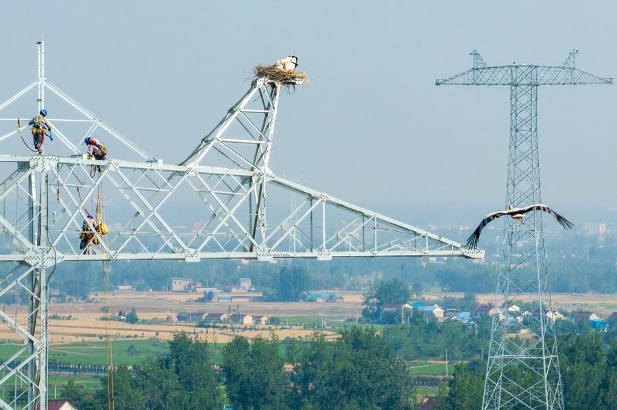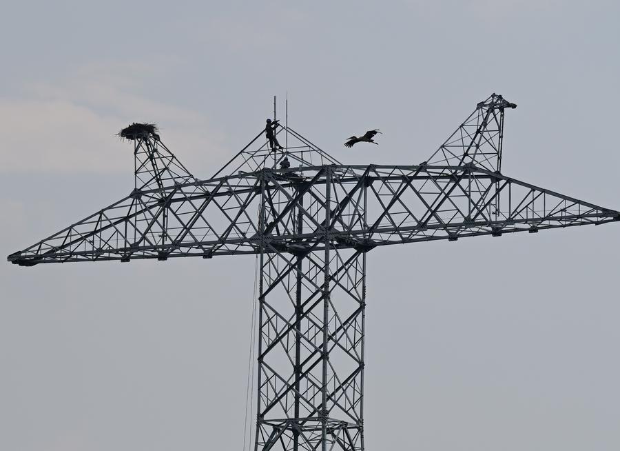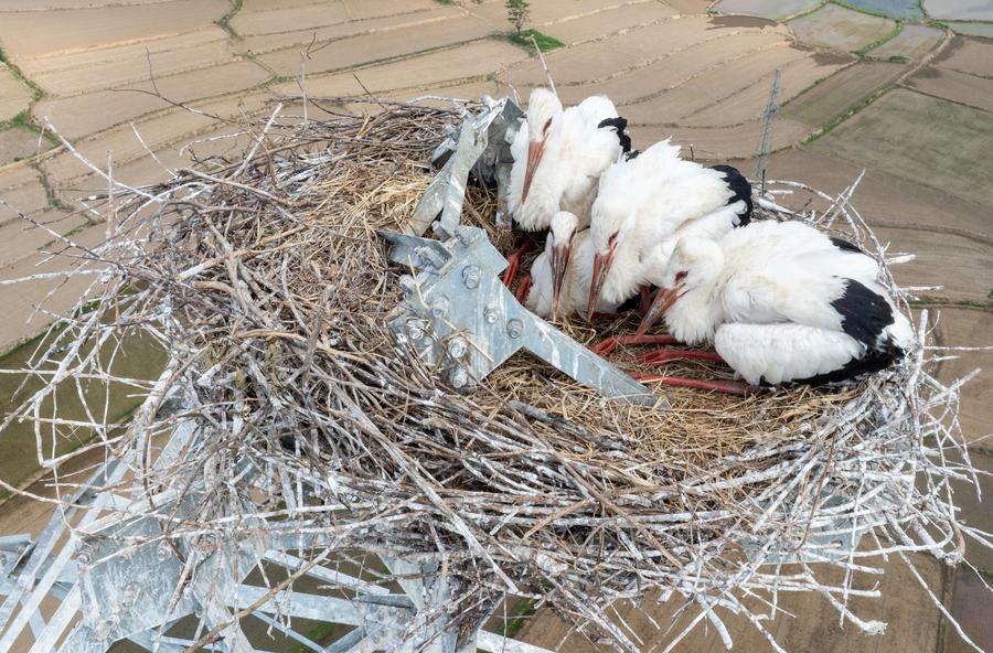 An aerial drone photo taken on May 21, 2025 shows an oriental white stork taking care of the nestlings on top of a transmission tower in Huoqiu County, east China's Anhui Province.(Photo by Zheng Xianlie/Xinhua)An aerial drone photo taken on May 20, 2025 shows a nest of oriental white storks on a transmission tower in Huoqiu County, east China's Anhui Province. (Photo by Zheng Xianlie/Xinhua)An oriental white stork perches on top of a transmission tower in Huoqiu County, east China's Anhui Province, May 20, 2025. (Xinhua/Zhou Mu)An aerial drone photo taken on May 21, 2025 shows oriental white storks taking care of the nestlings on top of a transmission tower in Huoqiu County, east China's Anhui Province. (Xinhua/Zhou Mu)An aerial drone photo taken on May 20, 2025 shows workers of State Grid Anhui Electric Power Co., Ltd. installing a camera near the nest of oriental white storks in Huoqiu County, east China's Anhui Province. (Photo by Zhao Xianfu/Xinhua)An aerial drone photo taken on May 20, 2025 shows workers of State Grid Anhui Electric Power Co., Ltd. installing a camera near the nest of oriental white storks in Huoqiu County, east China's Anhui Province. (Photo by Zhao Xianfu/Xinhua)An aerial drone photo taken on May 20, 2025 shows workers of State Grid Anhui Electric Power Co., Ltd. installing a camera near the nest of oriental white storks in Huoqiu County, east China's Anhui Province. (Photo by Zheng Xianlie/Xinhua)Workers of State Grid Anhui Electric Power Co., Ltd. install a camera near the nest of oriental white storks in Huoqiu County, east China's Anhui Province, May 20, 2025. (Xinhua/Zhou Mu)An aerial drone photo taken on May 21, 2025 shows oriental white storks taking care of the nestlings on top of a transmission tower in Huoqiu County, east China's Anhui Province. (Xinhua/Zhou Mu)An aerial drone photo taken on May 21, 2025 shows oriental white storks taking care of the nestlings on top of a transmission tower in Huoqiu County, east China's Anhui Province. (Xinhua/Zhou Mu)