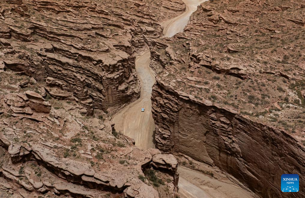 A drone photo shows a car racing during Stage 1 of the 2025 Taklimakan Rally in Wensu County, Aksu Prefecture, northwest China's Xinjiang Uygur Autonomous Region, May 21, 2025. (Xinhua/Hu Xingyu)