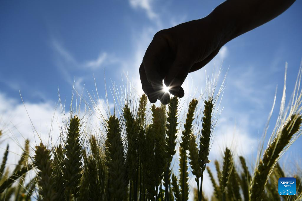 A farmer checks the growth of wheat in Yulong Naxi Autonomous County in Lijiang City, southwest China's Yunnan Province, May 21, 2025. The traditional Chinese solar term Xiaoman (Grain Buds) falls on May 21 this year. (Photo by Zhao Qingzu/Xinhua)