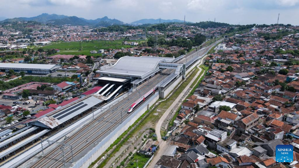 An aerial drone photo taken on May 20, 2025 shows the Karawang Station of Jakarta-Bandung High-Speed Railway (HSR) in Karawang, Indonesia.