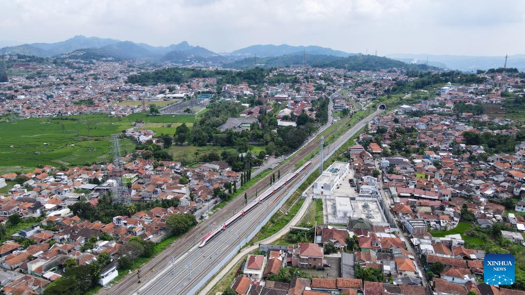 An aerial drone photo taken on May 20, 2025 shows a high-speed electrical multiple unit (EMU) train at Padalarang Station of the Jakarta-Bandung High-Speed Railway (HSR) in Padalarang, Indonesia.