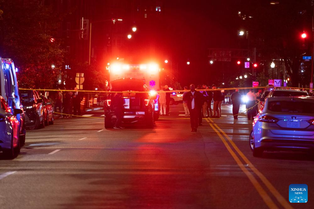 This photo taken on May 22, 2025 shows the site where two Israeli embassy employees were killed in Washington D.C., the United States. Two Israeli embassy employees were killed late Wednesday near a Jewish museum in Washington D.C., U.S. Homeland Security Secretary Kristi Noem said. (Xinhua/Hu Yousong)