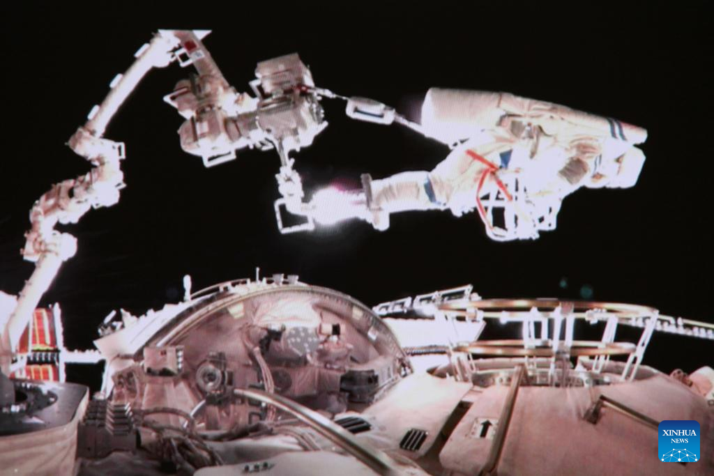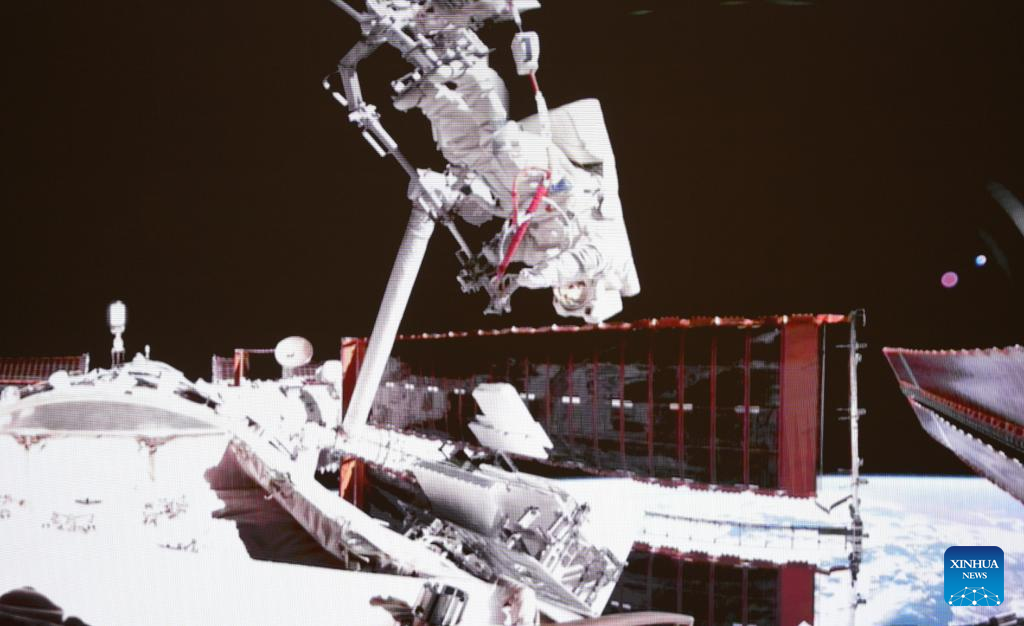 This video screenshot taken at Beijing Aerospace Control Center on May 22, 2025 shows Shenzhou-20 astronaut Chen Dong leaving China's orbiting space station for extravehicular activities. The Shenzhou-20 crew on board China's orbiting space station completed their mission's first series of extravehicular activities on Thursday, according to the China Manned Space Agency. (Xinhua/Li Yanchen)