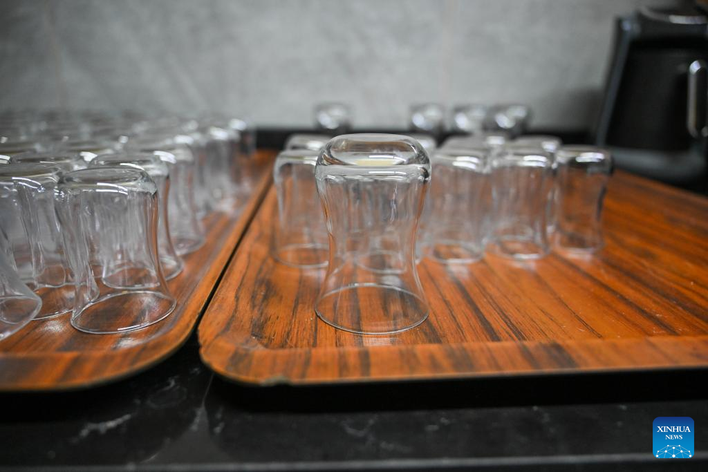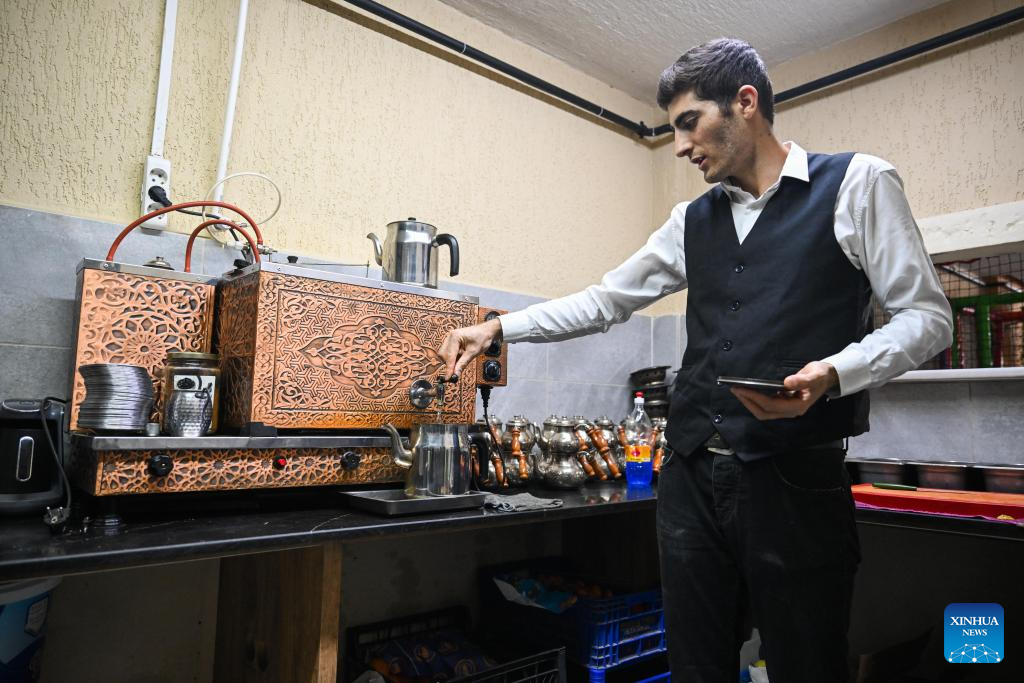 A staff member prepares to serve tea to customers at a teahouse in Istanbul, Türkiye, May 21, 2025. (Xinhua/Liu Lei)