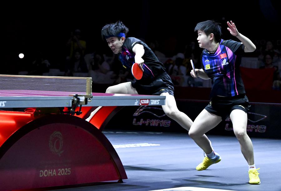 DOHA, May 22 (Xinhua) -- Olympic champions Wang Chuqin and Sun Yingsha overcame a slow start to beat Japan 3-1 in the World Table Tennis Championships mixed doubles quarterfinals on Thursday.