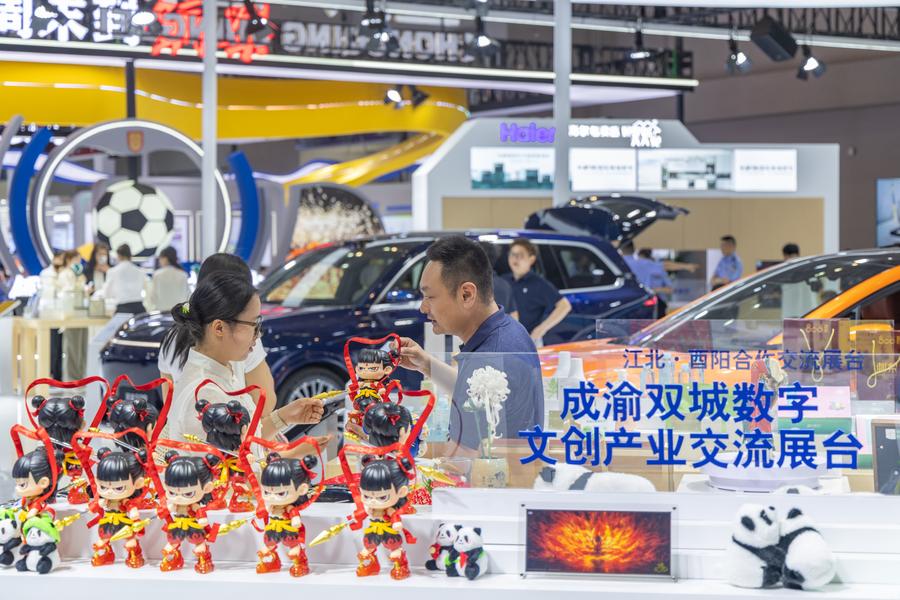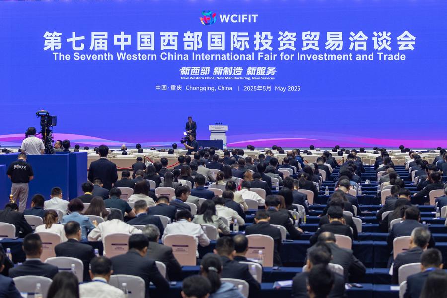 This photo taken on May 22, 2025 shows a signing ceremony of major projects during the 7th Western China International Fair for Investment and Trade in southwest China's Chongqing Municipality. (Xinhua/Huang Wei)Guests attend the opening ceremony of the 7th Western China International Fair for Investment and Trade in southwest China's Chongqing Municipality, May 22, 2025. (Xinhua/Huang Wei)A merchant from South Korea (1st R) introduces his products to visitors during the 7th Western China International Fair for Investment and Trade in southwest China's Chongqing Municipality, May 22, 2025. (Xinhua/Chen Cheng)Visitors inquire about cultural and creative products during the 7th Western China International Fair for Investment and Trade in southwest China's Chongqing Municipality, May 22, 2025. (Xinhua/Huang Wei)