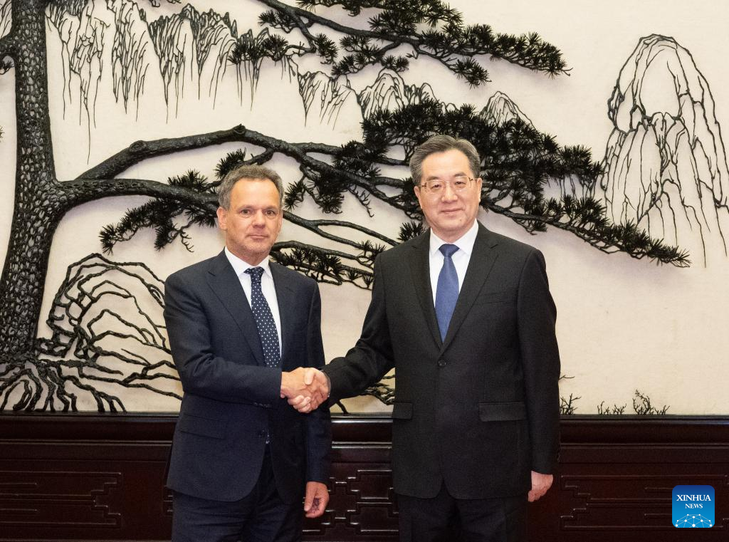 Chinese Vice Premier Ding Xuexiang, also a member of the Standing Committee of the Political Bureau of the Communist Party of China Central Committee, meets with Foreign Minister of the Netherlands Caspar Veldkamp in Beijing, capital of China, May 22, 2025. (Xinhua/Shen Hong)