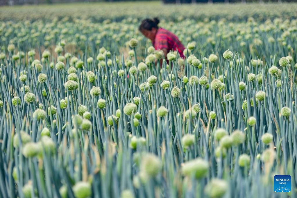 A farmer takes care of green onions at a field in Qingzhou City, east China's Shandong Province, May 21, 2025. The traditional Chinese solar term Xiaoman (Grain Buds) falls on May 21 this year, indicating that grain seeds are becoming full. (Photo by Wang Jilin/Xinhua)
