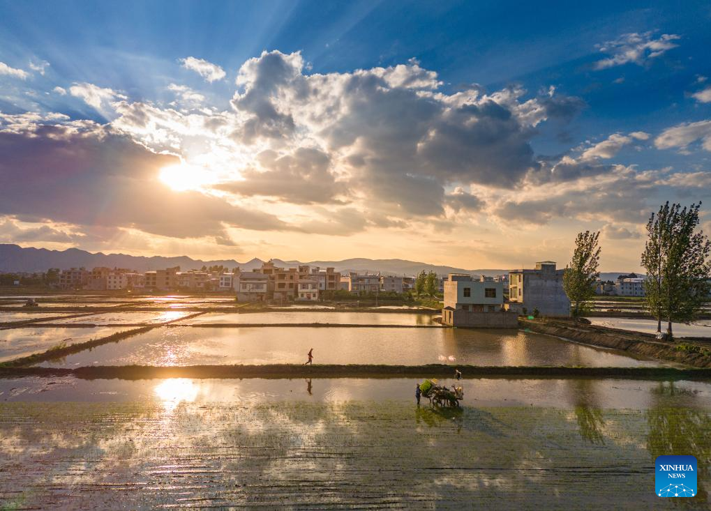 An aerial drone photo taken on May 21, 2025 shows farmers plowing the farmland in Baimadu Town of Daoxian County in Yongzhou City, central China's Hunan Province. The traditional Chinese solar term Xiaoman (Grain Buds) falls on May 21 this year, indicating that grain seeds are becoming full. (Photo by He Hongfu/Xinhua)