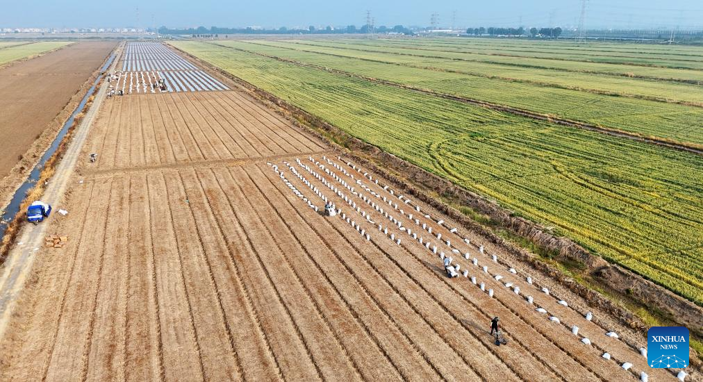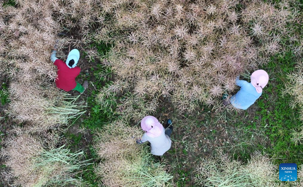 An aerial drone photo taken on May 21, 2025 shows farmers harvesting cole in a field in Lixiahe, east China's Jiangsu Province. The traditional Chinese solar term Xiaoman (Grain Buds) falls on May 21 this year, indicating that grain seeds are becoming full. (Photo by Meng Delong/Xinhua)