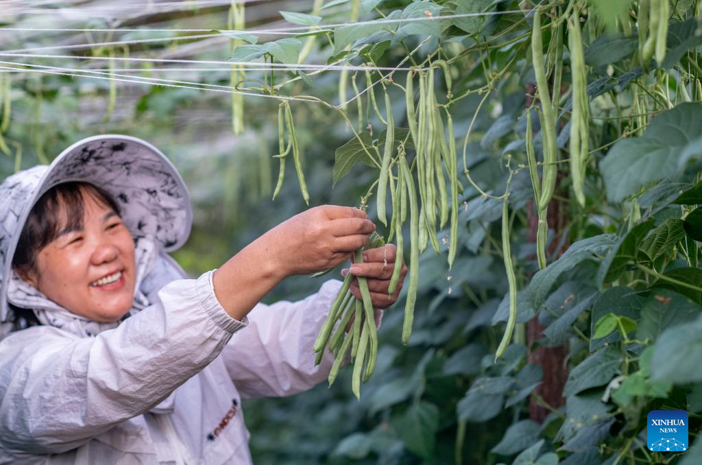A farmer harvests green beans at a vegetable farm in Wenshan Zhuang and Miao Autonomous Prefecture of southwest Yunnan Province, May 21, 2025. The traditional Chinese solar term Xiaoman (Grain Buds) falls on May 21 this year, indicating that grain seeds are becoming full. (Photo by Xiong Pingxiang/Xinhua)