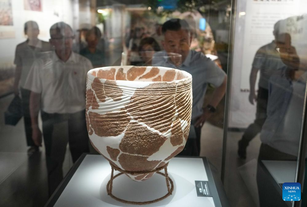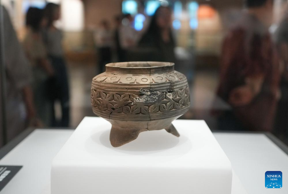 This photo taken on May 20, 2025 shows a pottery pot displayed at the Dawenkou Site Museum in Tai'an, east China's Shandong Province. The 2,600-square-meter Dawenkou Site Museum in Tai'an shows the origin, development, connotation and importance of the Dawenkou Culture (4000 B.C.-2600 B.C.), a culture of the late Neolithic Age, to the public through relics display, scene restoration and multimedia demonstration, etc. (Xinhua/Xu Suhui)