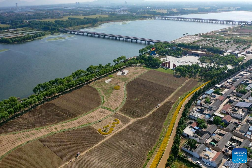 An aerial drone photo taken on May 20, 2025 shows the Dawen River (upper L), Dawenkou Site Museum (upper R) and the core area of the Dawenkou site in Tai'an, east China's Shandong Province. The 2,600-square-meter Dawenkou Site Museum in Tai'an shows the origin, development, connotation and importance of the Dawenkou Culture (4000 B.C.-2600 B.C.), a culture of the late Neolithic Age, to the public through relics display, scene restoration and multimedia demonstration, etc. (Xinhua/Chen Shuo)