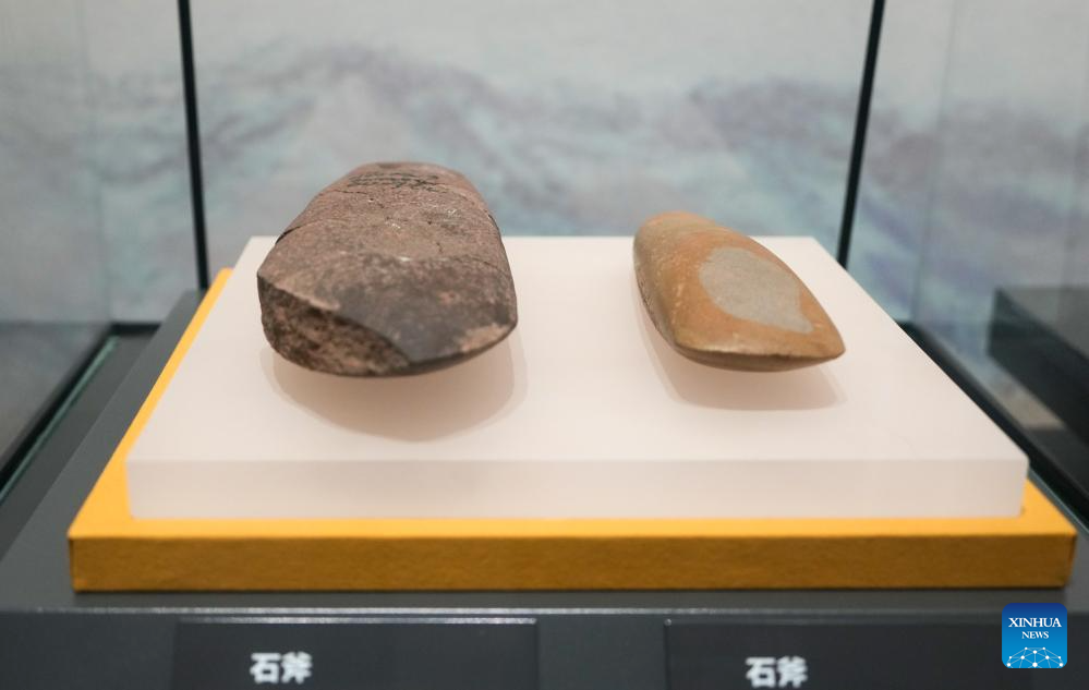This photo taken on May 20, 2025 shows stone axes displayed at the Dawenkou Site Museum in Tai'an, east China's Shandong Province. The 2,600-square-meter Dawenkou Site Museum in Tai'an shows the origin, development, connotation and importance of the Dawenkou Culture (4000 B.C.-2600 B.C.), a culture of the late Neolithic Age, to the public through relics display, scene restoration and multimedia demonstration, etc. (Xinhua/Xu Suhui)