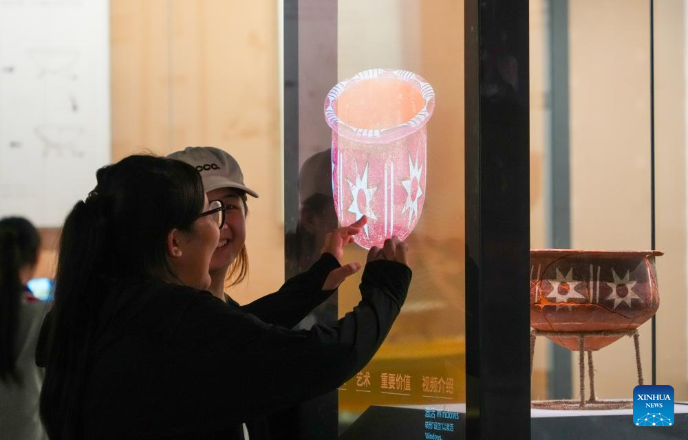 People look at a piece of cultural relics through multimedia demonstration at the Dawenkou Site Museum in Tai'an, east China's Shandong Province, May 20, 2025. The 2,600-square-meter Dawenkou Site Museum in Tai'an shows the origin, development, connotation and importance of the Dawenkou Culture (4000 B.C.-2600 B.C.), a culture of the late Neolithic Age, to the public through relics display, scene restoration and multimedia demonstration, etc. (Xinhua/Xu Suhui)