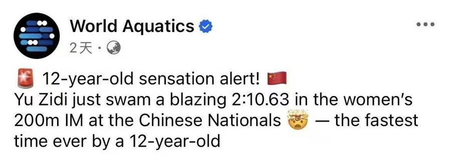 "12-year-old sensation alert!" the sport's world governing body World Aquatics wrote in a social media post, describing Yu's 2:10.63 in the women's 200m individual medley a "blazing" time and confirmed it "the fastest time ever by a 12-year-old."