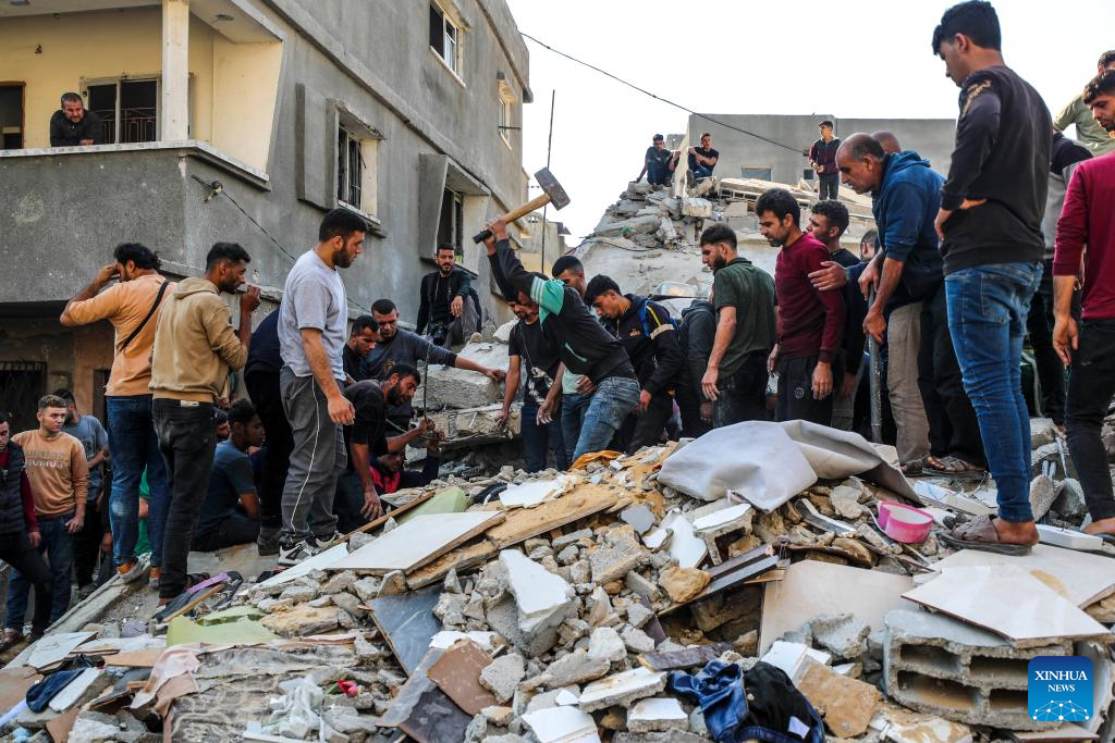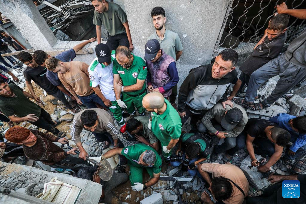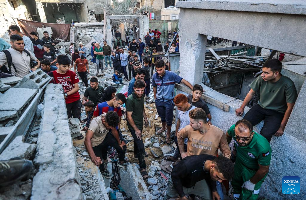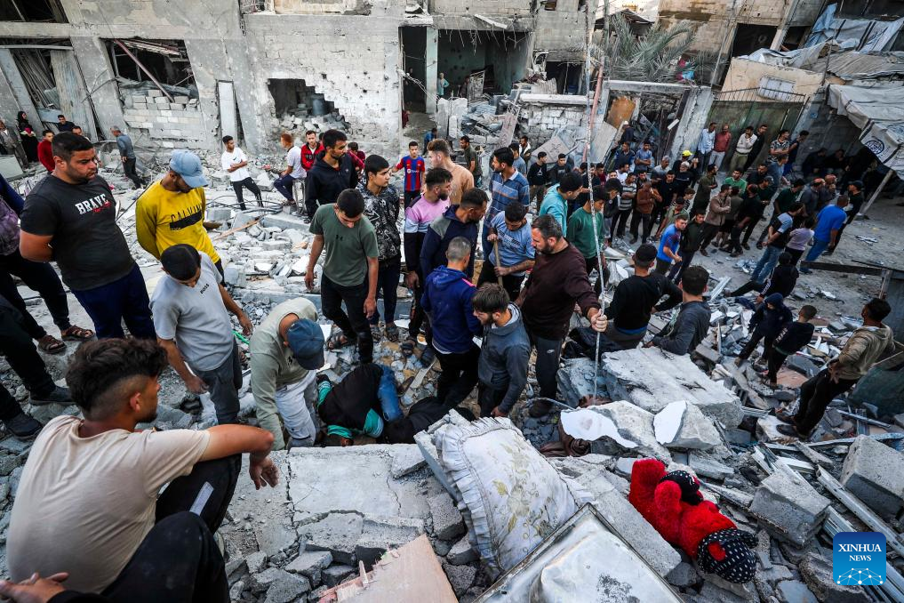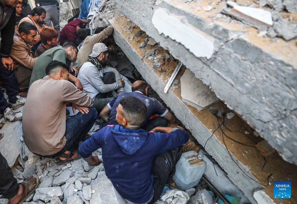 Palestinians search for survivors after an Israeli airstrike in Jabalia refugee camp, northern Gaza Strip, on May 23, 2025. The Israel Defense Forces (IDF) said in a statement on Friday that its air force struck more than 75 targets across the Gaza Strip over the past day. (Photo by Mahmoud Zaki/Xinhua)
