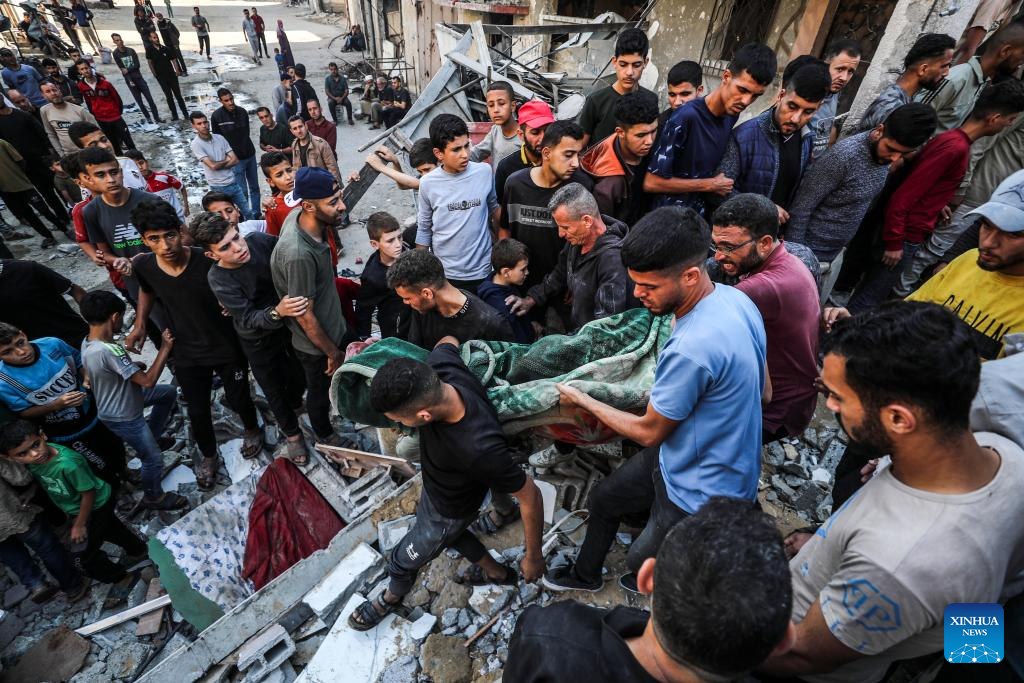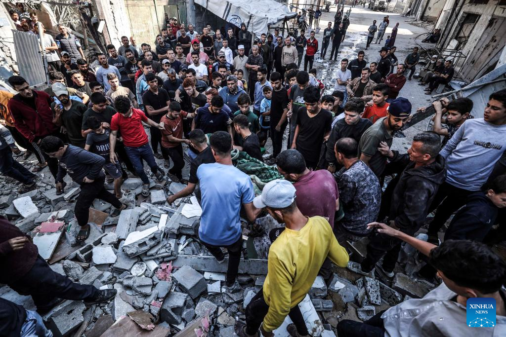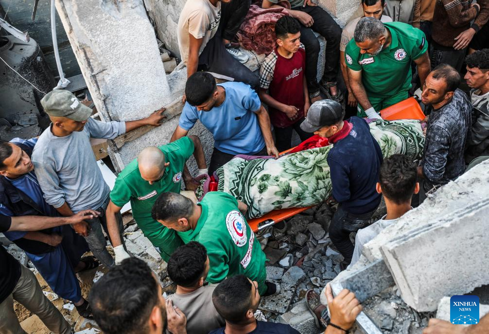 Palestinians transfer a victim after an Israeli airstrike in Jabalia refugee camp, northern Gaza Strip, on May 23, 2025. The Israel Defense Forces (IDF) said in a statement on Friday that its air force struck more than 75 targets across the Gaza Strip over the past day. (Photo by Mahmoud Zaki/Xinhua)