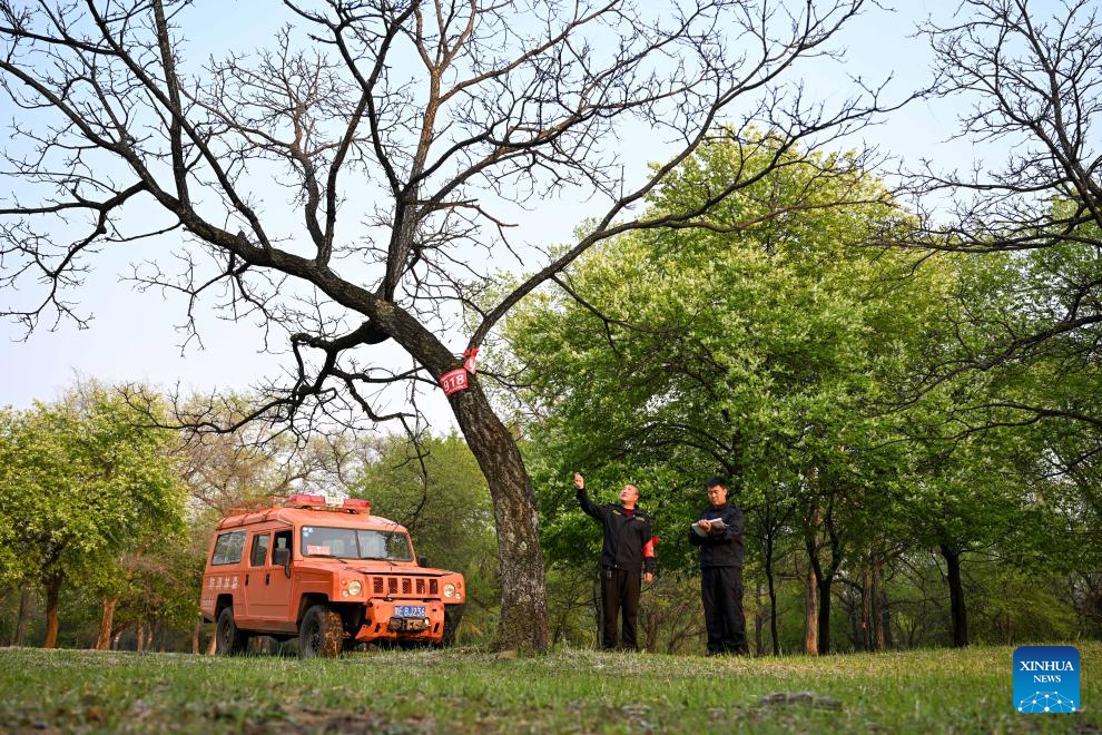 Forest ranger Cao Haihong (L) and his colleague monitor growth conditions of an Amur Cork-tree, a second-class protected plant in China, at Baimaogou Forest Farm in Zhalantun City, north China's Inner Mongolia Autonomous Region, May 20, 2025. (Xinhua/Bei He)