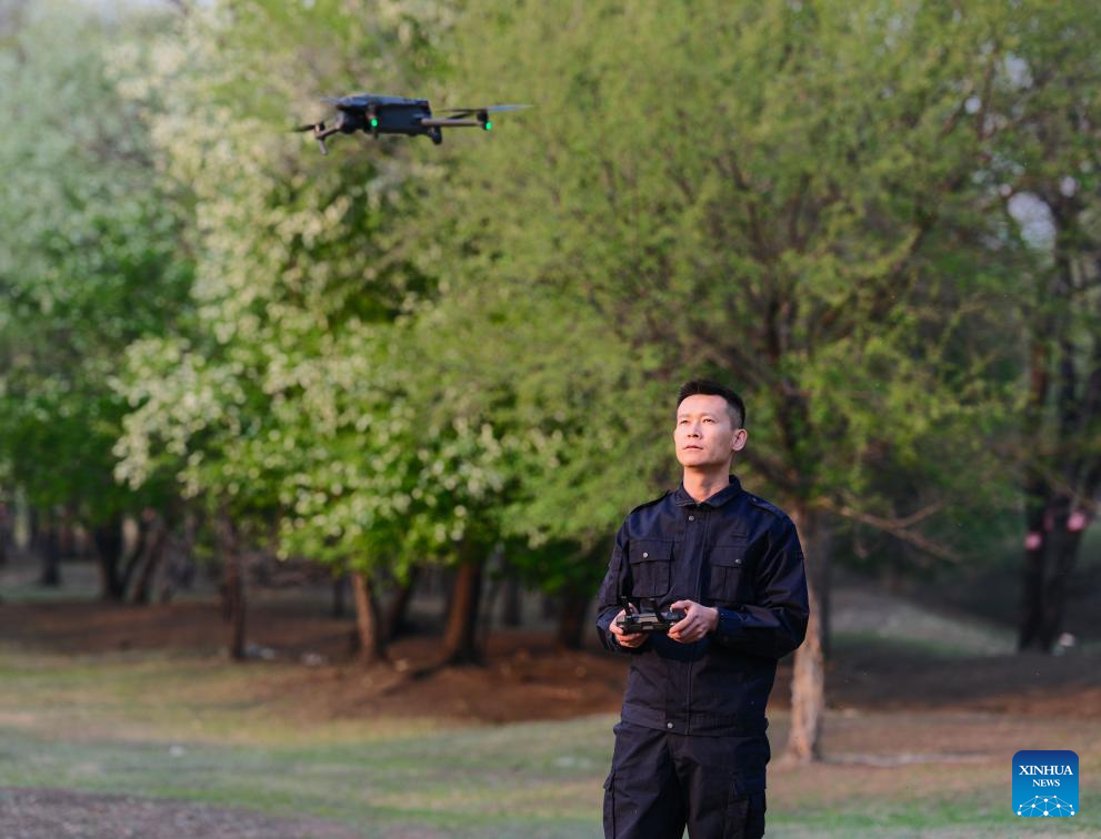 Forest ranger Liu Batu conducts drone-assisted patrols of the wild habitat of Amur Cork-trees, a second-class protected plant in China, at Baimaogou Forest Farm in Zhalantun City, north China's Inner Mongolia Autonomous Region, May 20, 2025. (Xinhua/Ma Jinrui)