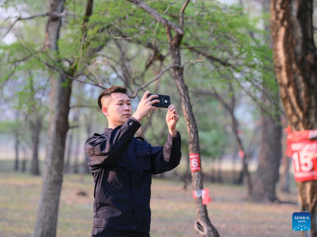 Forest ranger Yi Mingzhe equips a tree with an infrared camera at Chaihekou Forest Farm in Zhalantun City, north China's Inner Mongolia Autonomous Region, May 21, 2025. (Xinhua/Bei He)