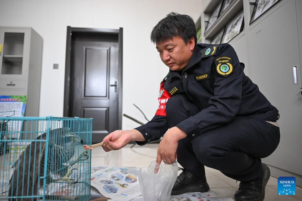Forest ranger Yi Mingzhe feeds a rescued goshawk at Chaihe Forestry Bureau in Zhalantun City, north China's Inner Mongolia Autonomous Region, May 21, 2025. (Xinhua/Bei He)