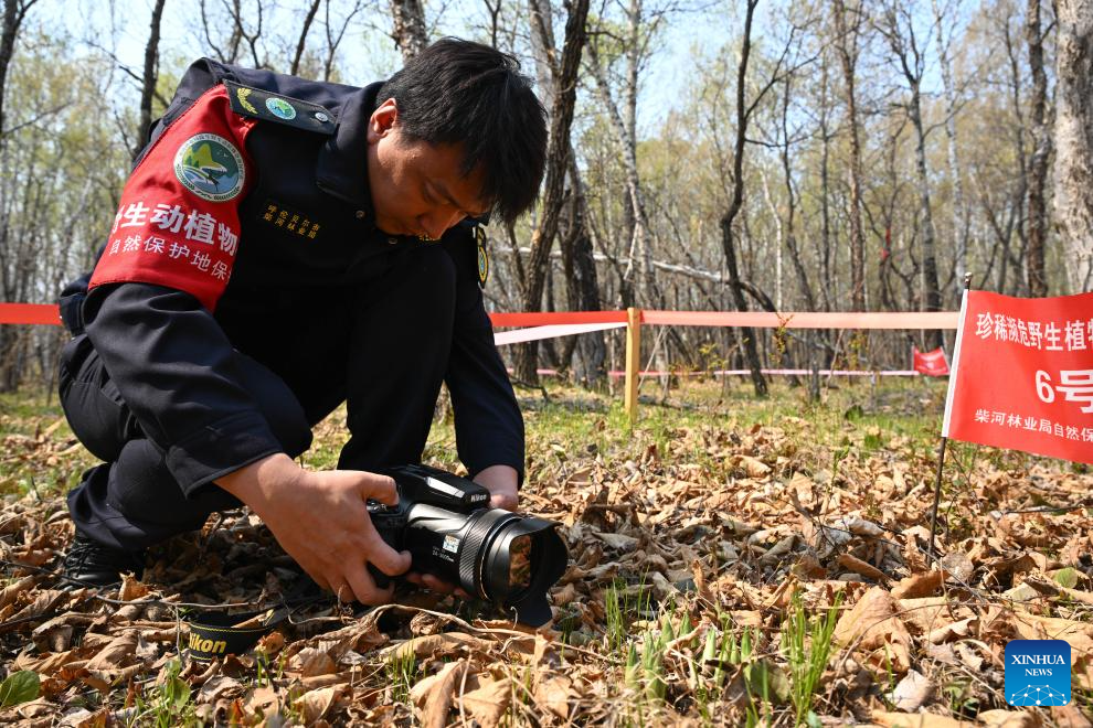 Forest ranger Yi Mingzhe takes photos of large-flowered lady's slipper orchids, a second-class protected plant in China, at Chaihekou Forest Farm in Zhalantun City, north China's Inner Mongolia Autonomous Region, May 21, 2025. (Xinhua/Bei He)