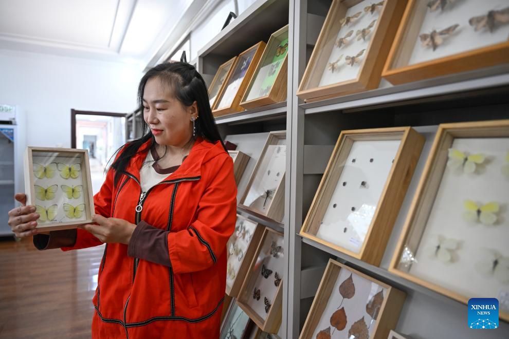 Staff member Zhang Bin from Chaihe Forestry Bureau shows locally collected butterfly specimens in Zhalantun City, north China's Inner Mongolia Autonomous Region, May 21, 2025. (Xinhua/Bei He)