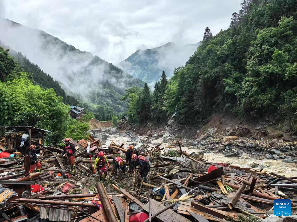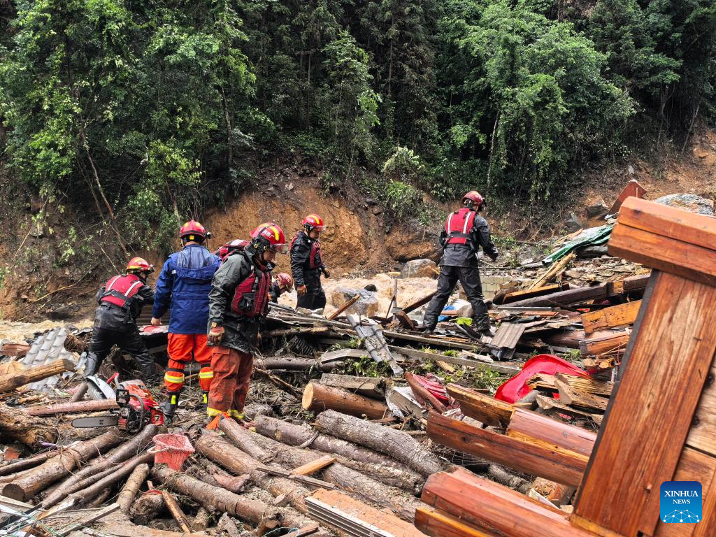 Rescuers work at the site of a mudslide in Longsheng County, Guilin City of south China's Guangxi Zhuang Autonomous Region, on May 23, 2025. A mountain torrent and mudslide struck a village here early Friday morning. Eight people were suspected to be missing, according to preliminary assessment by local authorities.Ten houses sustained damage. Rescue efforts are underway. (Photo by Wei Jiyang/Xinhua)