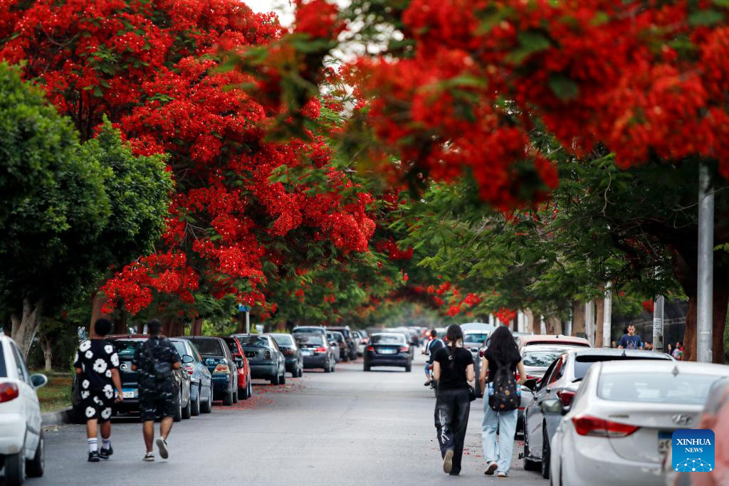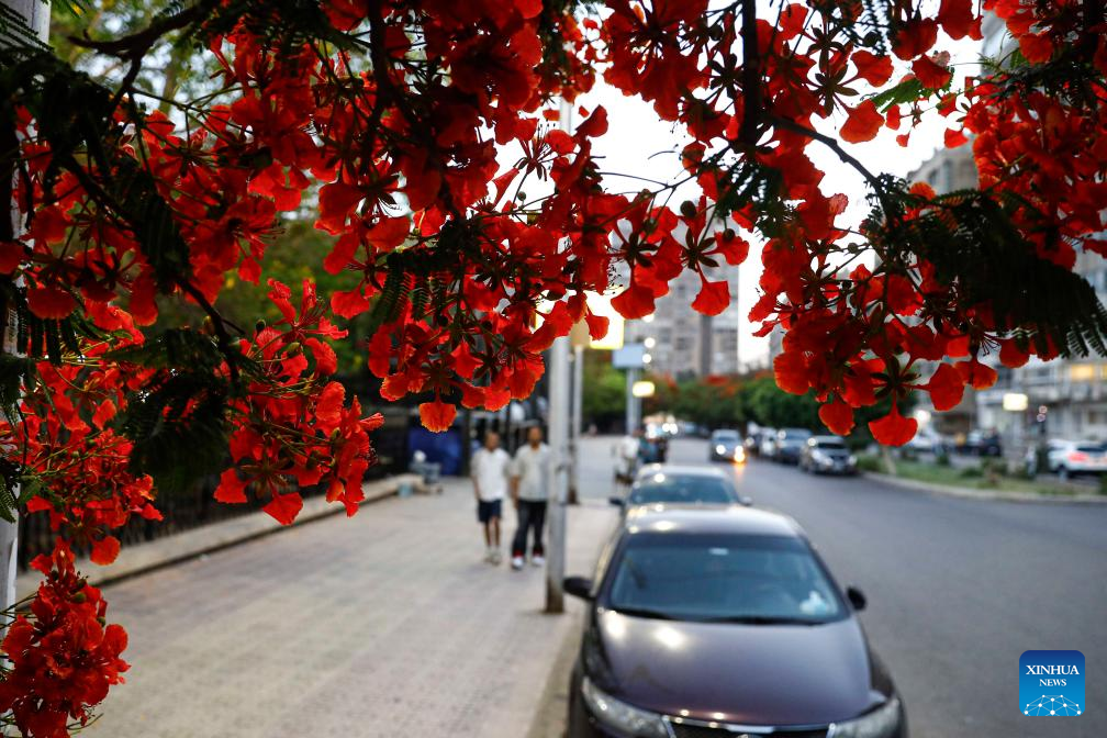 This photo taken on May 22, 2025 shows blooming royal poinciana trees on a street in Cairo, Egypt. (Xinhua/Ahmed Gomaa)
