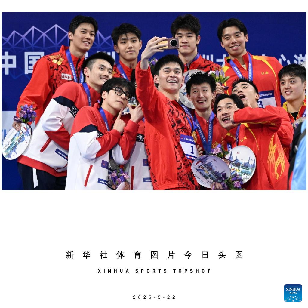 Gold medalist Sun Yang (C) of Team Zhejiang pose for photos with other medalists during the awarding ceremony for the men's 4x200 freestyle relay final at the 2025 National Swimming Championships in Shenzhen, south China's Guangdong Province, May 22, 2025. (Xinhua/Xia Yifang)