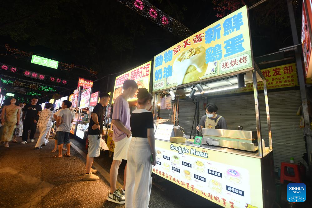 Lu explains that night market offers them an ideal starting point for small business, with steady customer flow and profits. The young couple see this venture as the first step toward their business success. (Xinhua/Huang Xiaobang)