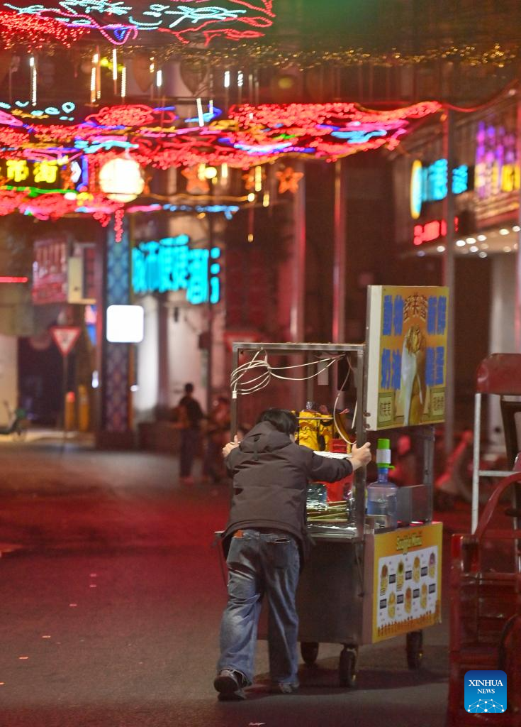 Lu Yiding packs up his cake stall in the early morning at the Xiguan night market in Nanning, south China's Guangxi Zhuang Autonomous Region, on April 7, 2025. (Xinhua/Huang Xiaobang)