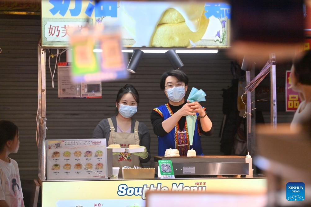 Lu Yiding sells cakes at the Xiguan night market in Nanning, south China's Guangxi Zhuang Autonomous Region, on April 6, 2025. (Xinhua/Huang Xiaobang)
