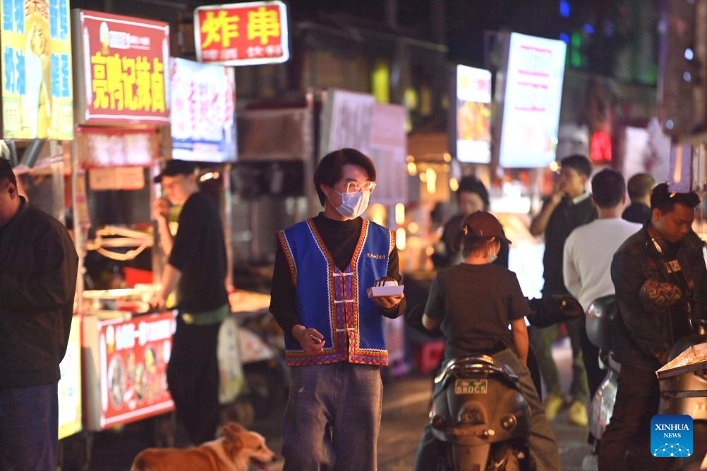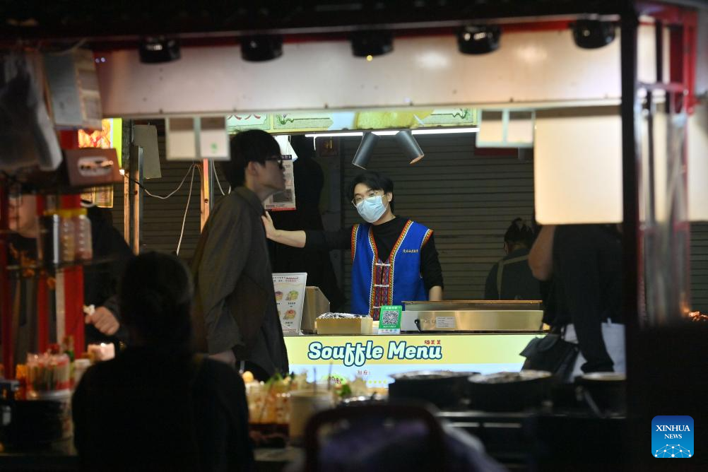 Lu Yiding serves cakes to customers at the Xiguan night market in Nanning, south China's Guangxi Zhuang Autonomous Region, on April 7, 2025. (Xinhua/Huang Xiaobang)