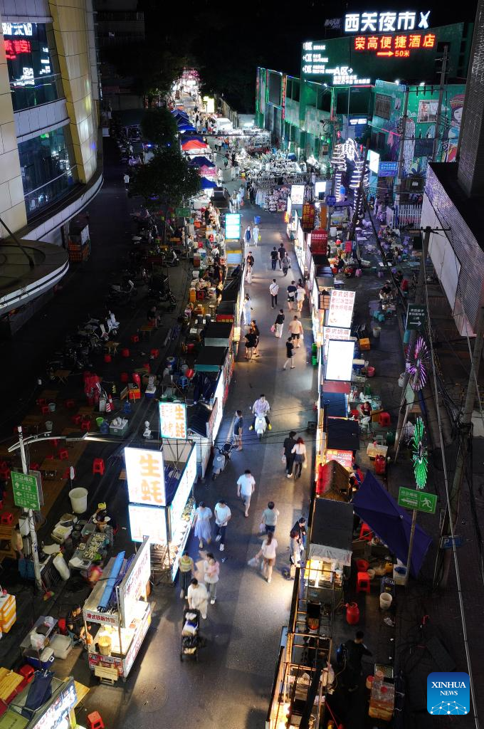 An aerial drone photo taken on May 22, 2025 shows the Xiguan night market in Nanning, south China's Guangxi Zhuang Autonomous Region. (Xinhua/Huang Xiaobang)