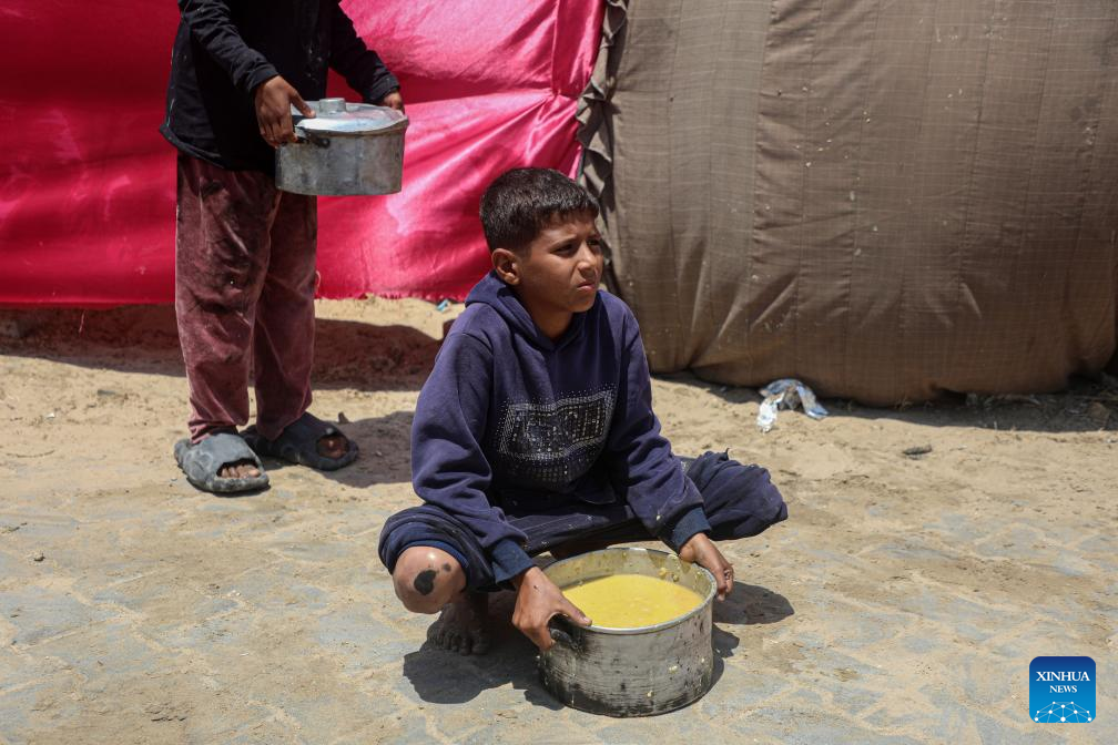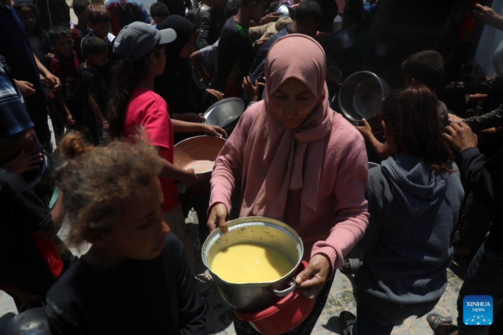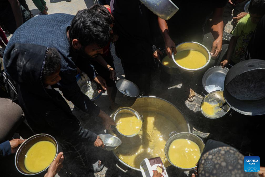 Palestinians receive free food from a food distribution center in Gaza City, on May 22, 2025. (Photo by Rizek Abdeljawad/Xinhua)