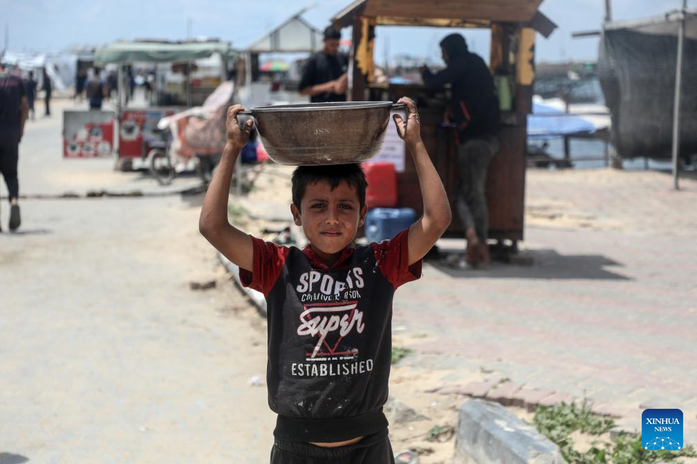 A Palestinian boy is seen with free food received from a food distribution center in Gaza City, on May 22, 2025. (Photo by Rizek Abdeljawad/Xinhua)