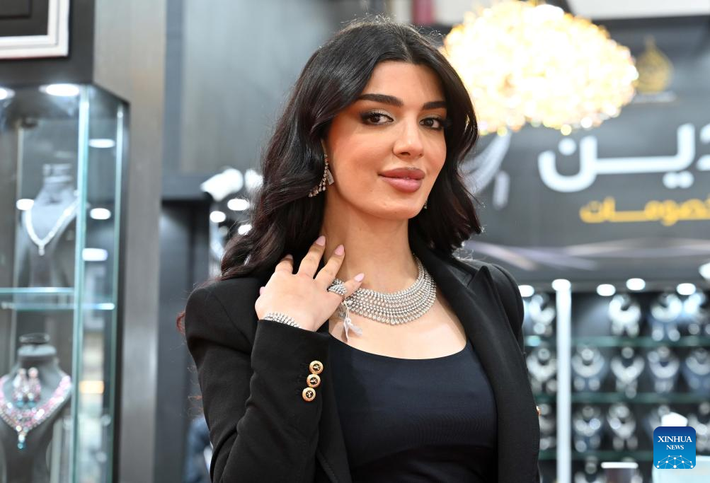 Women display jewelry at the 23rd International Gold and Jewelry Exhibition in Hawalli Governorate, Kuwait, on May 21, 2025. (Photo by Asad/Xinhua)