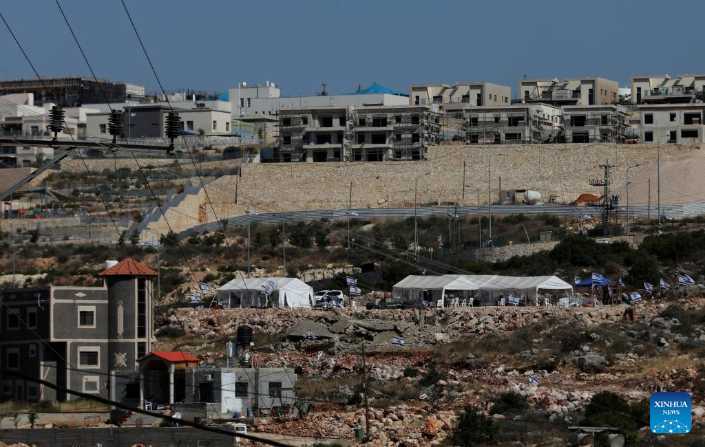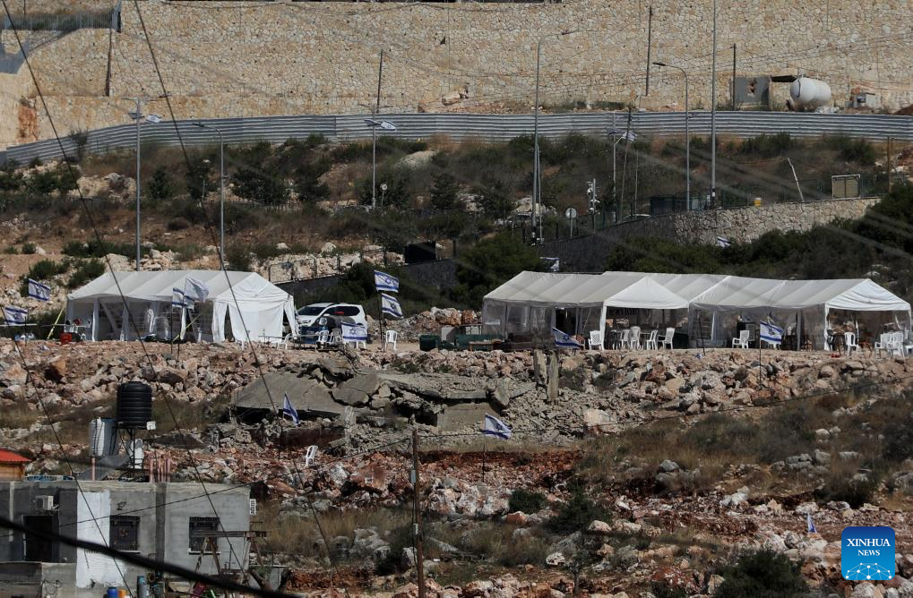 This photo taken on May 23, 2025 shows tents set up by Israeli settlers near the West Bank village of Bruqin. About 40 Israeli settlers rioted in the village of Burqin in the West Bank, burning houses and cars, Israel's state-owned Kan TV News reported on Friday. (Photo by Ayman Nobani/Xinhua)