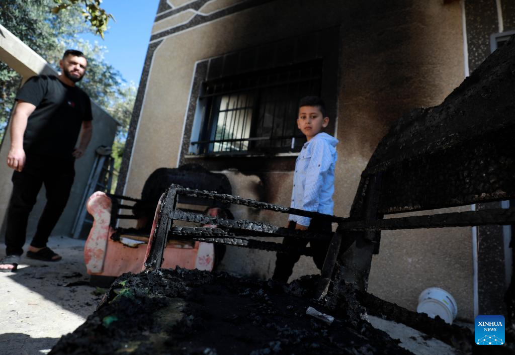 Palestinians inspect a house burned by Israeli settlers in the village of Burqin near the West Bank city of Salfit, on May 23, 2025. About 40 Israeli settlers rioted in the Palestinian village of Burqin in the West Bank, burning houses and cars, Israel's state-owned Kan TV News reported on Friday. (Photo by Ayman Nobani/Xinhua)