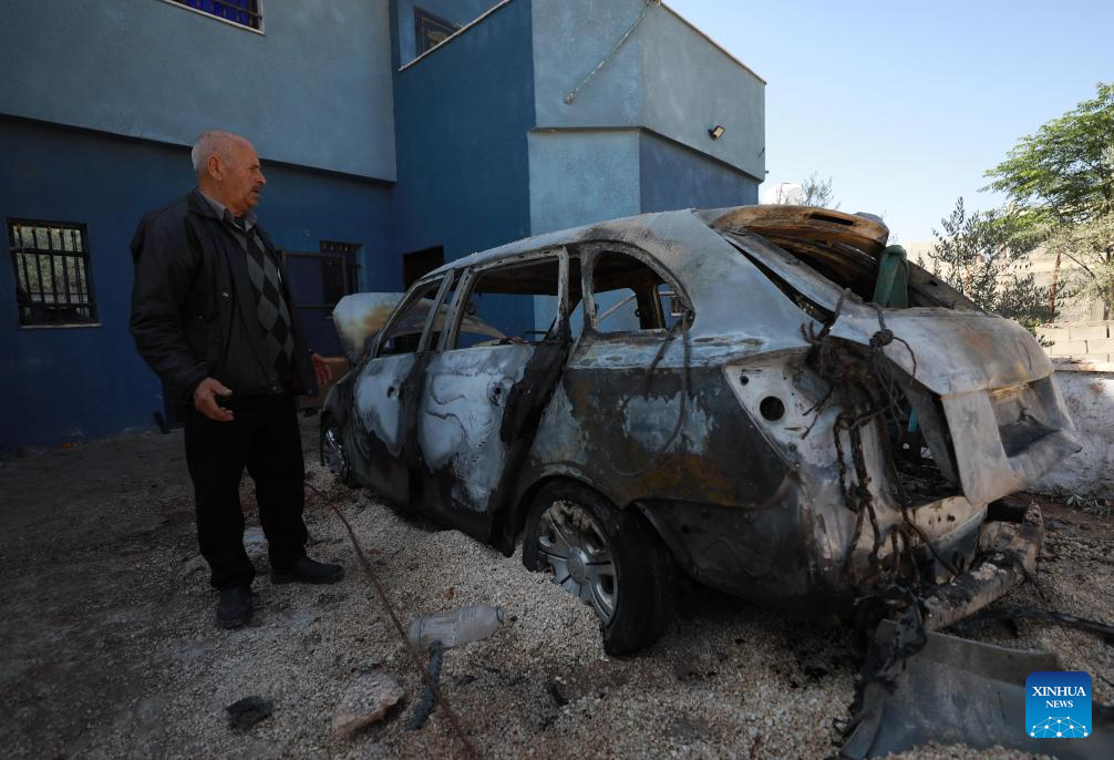 A Palestinian man inspects a vehicle burned by Israeli settlers in the village of Burqin near the West Bank city of Salfit, on May 23, 2025. About 40 Israeli settlers rioted in the Palestinian village of Burqin in the West Bank, burning houses and cars, Israel's state-owned Kan TV News reported on Friday. (Photo by Ayman Nobani/Xinhua)