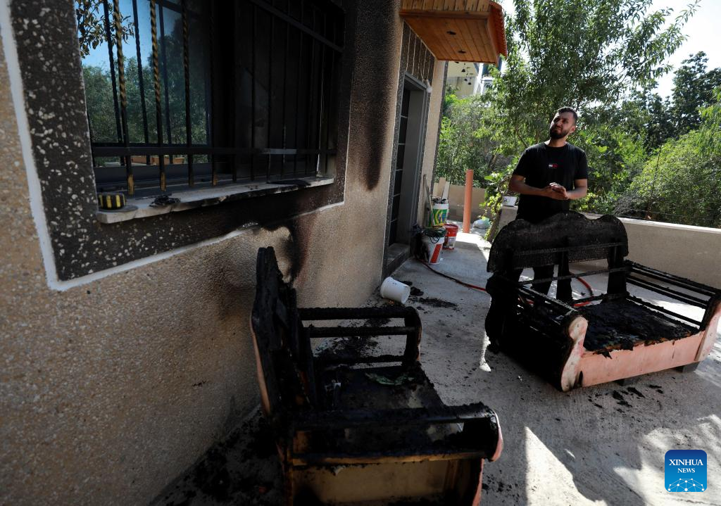 A Palestinian man inspects a house burned by Israeli settlers in the village of Burqin near the West Bank city of Salfit, on May 23, 2025. About 40 Israeli settlers rioted in the Palestinian village of Burqin in the West Bank, burning houses and cars, Israel's state-owned Kan TV News reported on Friday. (Photo by Ayman Nobani/Xinhua)