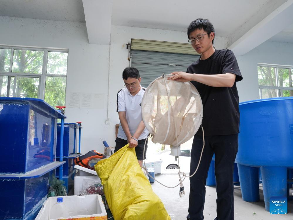 Yu Yi (R) and his colleague arrange equipment before a field research at the Fisheries Institute of Sichuan Academy of Agricultural Sciences in Chengdu, southwest China's Sichuan Province, May 6, 2025. (Xinhua/Wang Xi)