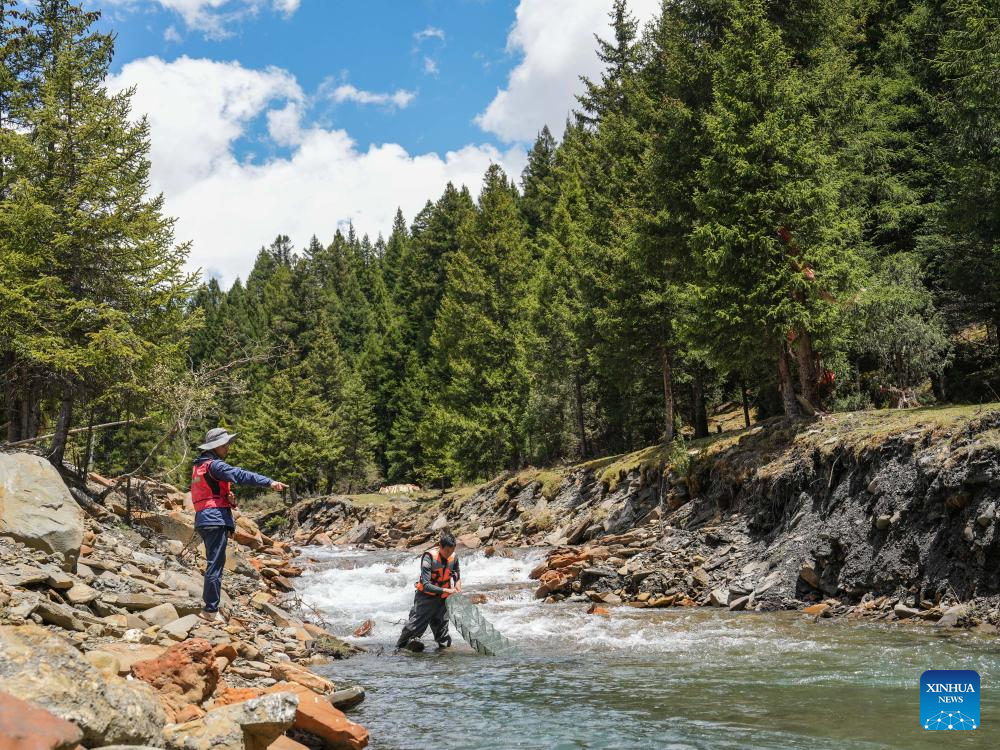 Yu Yi (R) checks newly caught fish in Songpan County of Aba Tibetan and Qiang Autonomous Prefecture, southwest China's Sichuan Province, May 20, 2025. (Xinhua/Wang Xi)