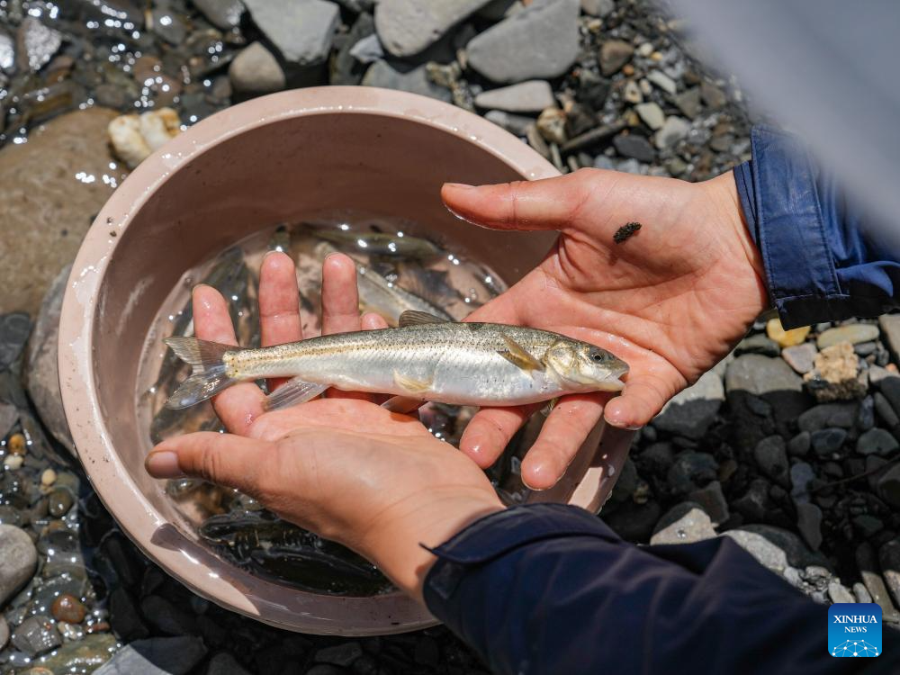 Yu Yi releases the fish he caught for research in Songpan County of Aba Tibetan and Qiang Autonomous Prefecture, southwest China's Sichuan Province, May 20, 2025. (Xinhua/Wang Xi)