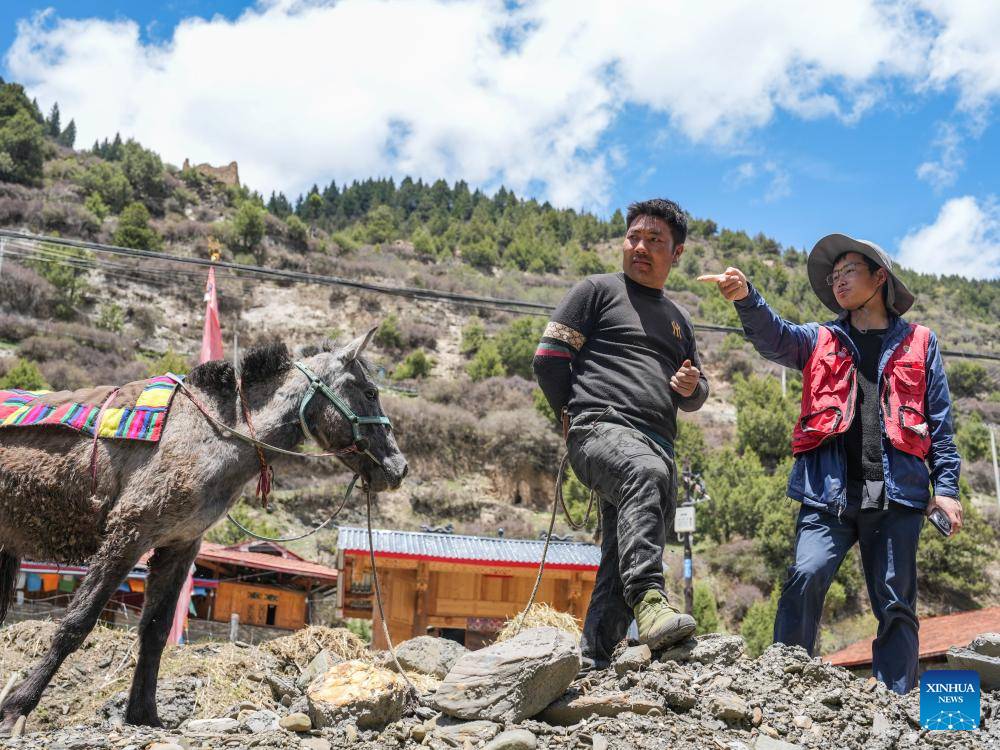 Yu Yi (R) learns about fish resources from a villager in Songpan County of Aba Tibetan and Qiang Autonomous Prefecture, southwest China's Sichuan Province, May 20, 2025. (Xinhua/Wang Xi)